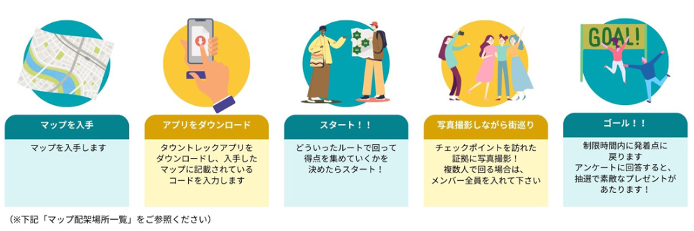 開催期間中、参加店舗などに配架されているマップを入手したら、専用アプリを利用して好きな日時に自由に参加いただけます。参加無料で事前申し込み不要。従来のスタンプラリーにゲーム要素を取り込んだ感覚で街巡りを楽しむことができます。抽選で当たる当地域ゆかりのプレゼントも用意されていますので、この機会にぜひご参加ください!