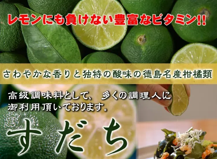 徳島県を代表する柑橘「すだち」。その爽やかな香りと酸味は、様々な料理にアクセントを加えてくれます。焼き魚や刺身に添えるのはもちろん、すだち蕎麦や、すだちを使ったドレッシングもおすすめです。