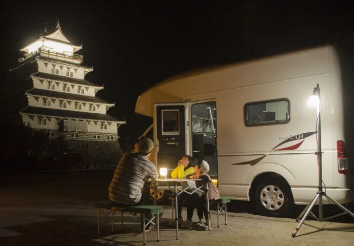 長崎県の島原城では、「島原城の城キャン」と呼ばれる車中泊プランが提供されています。天守の近くの駐車場で、乗用車やキャンピングカーに泊まれるのが特徴です。